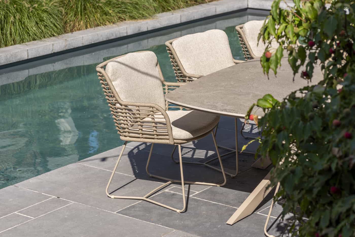De Fabrice dining stoel geeft je buitenruimte een elegante update. Het gepoedercoate aluminium frame in warme Latte-kleur is verfijnd afgewerkt met handgeweven rope dat een zachte, stijlvolle uitstraling biedt. De stoel wordt geleverd met twee all-weather kussens, waardoor jij optimaal zitcomfort hebt tijdens lange maaltijden of ontspannen momenten in de tuin.